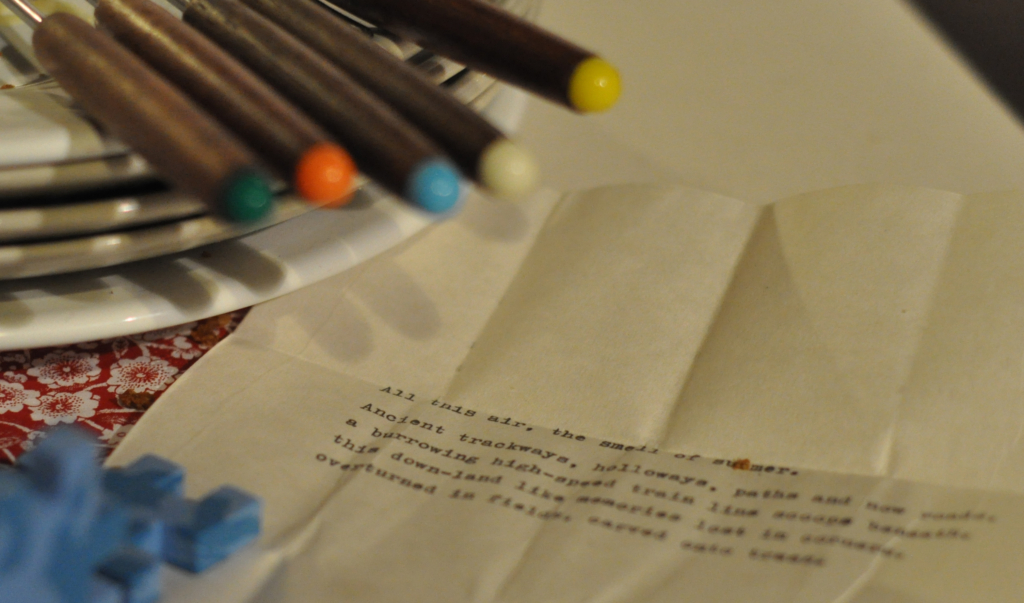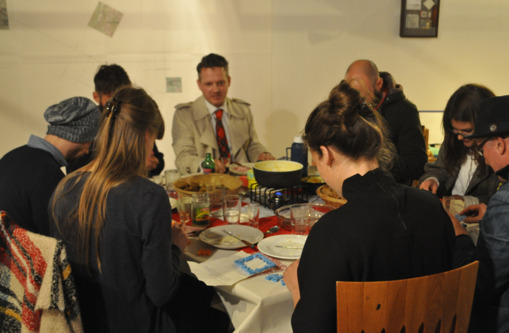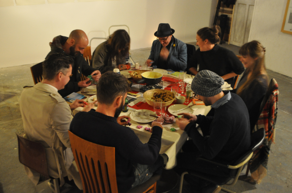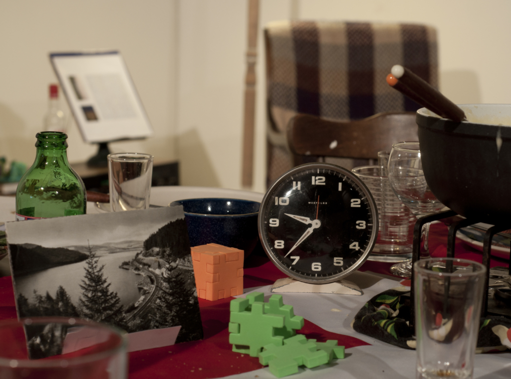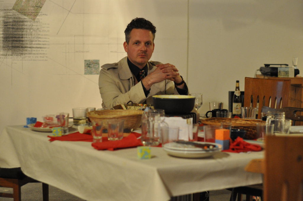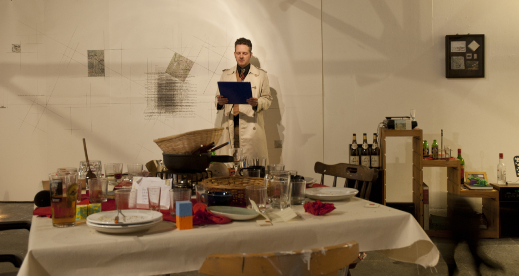 Fondue was only one element of an exhibition entitled Walking Home (Again) that took place at the Fish Factory in March and April 2015. The other elements were made up of the nine-part drawing How To Walk which has been previously discussed and is threaded throughout this thesis: Walking Home: Infinite Edition a stand- alone installation piece which includes a web-based work to which the audience are invited to contribute; Score which was a large work on paper which evolved over the course of the exhibition in direct relation to the fugues performed within Fondue; and a second, framed work on paper called For so long, the horizon. Appendix 12 is the published guide to the exhibition for how these works were placed within the space. On the exhibition floor plan number 9 is listed as “(Again): Found objects, false wall and door, framed c-type print”. The parenthesis refers to the iterative use of Walking Home as a title. First used in 2008 for my MA show, the phrase Walking Home was transferred onto the door of a shed at Dartington College of Arts that was an installation in which works towards the idea of Walking Home were shown. At the Fish Factory a false wall was constructed creating both a reference back to this previous incarnation of the work, whilst also creating an enclosed space within the gallery, suggesting that a world was being entered within which everything was part of the work.